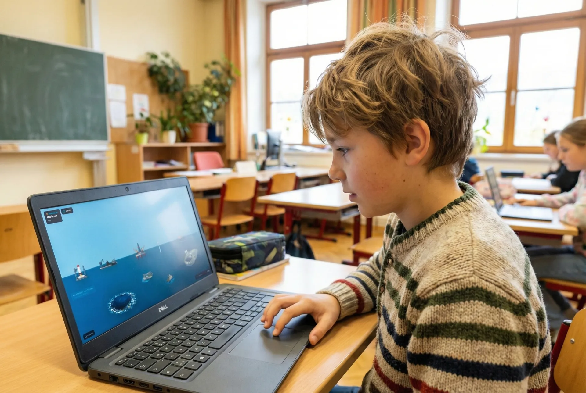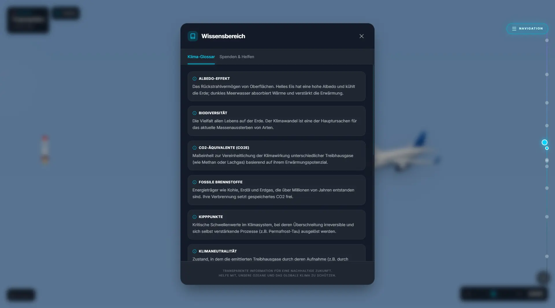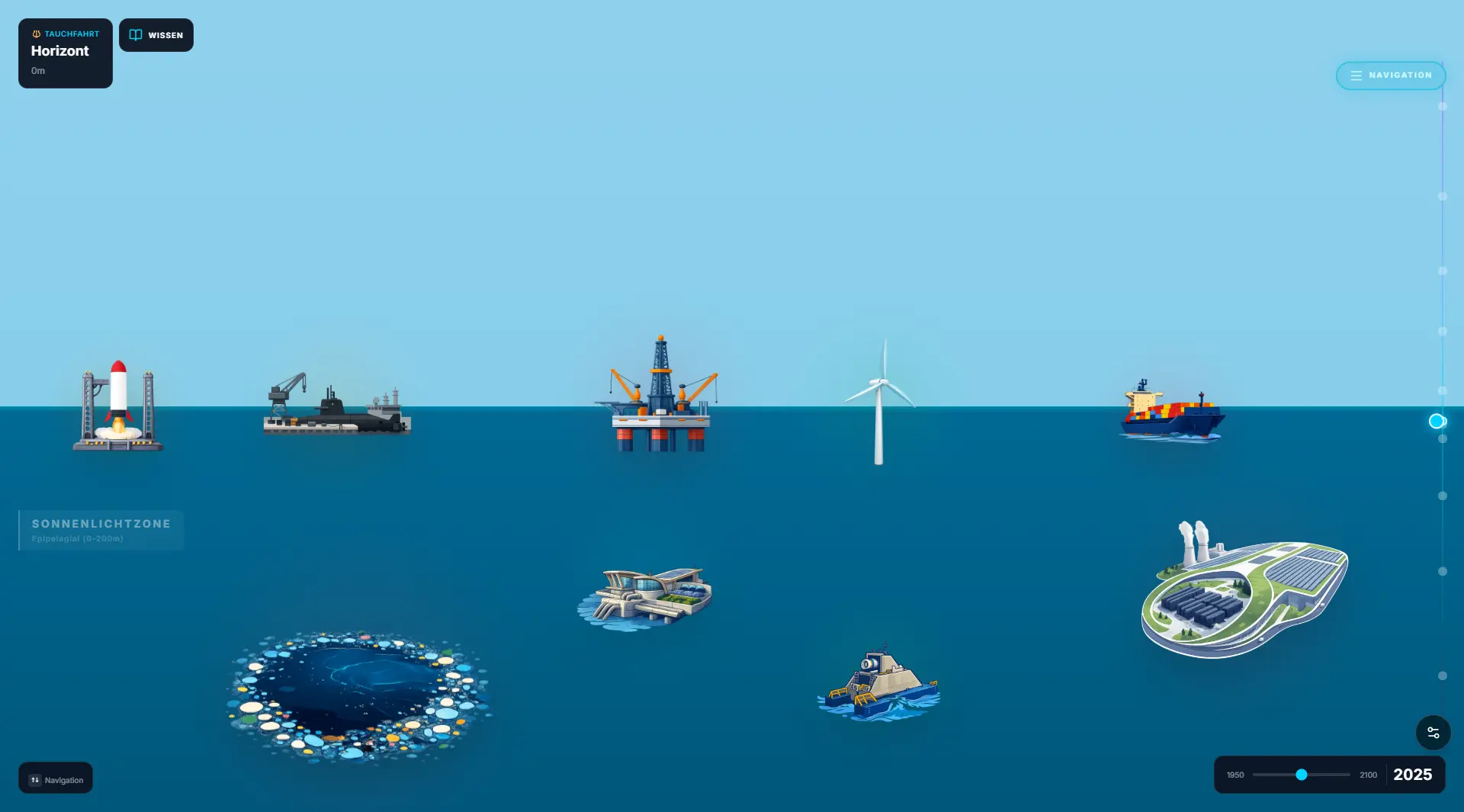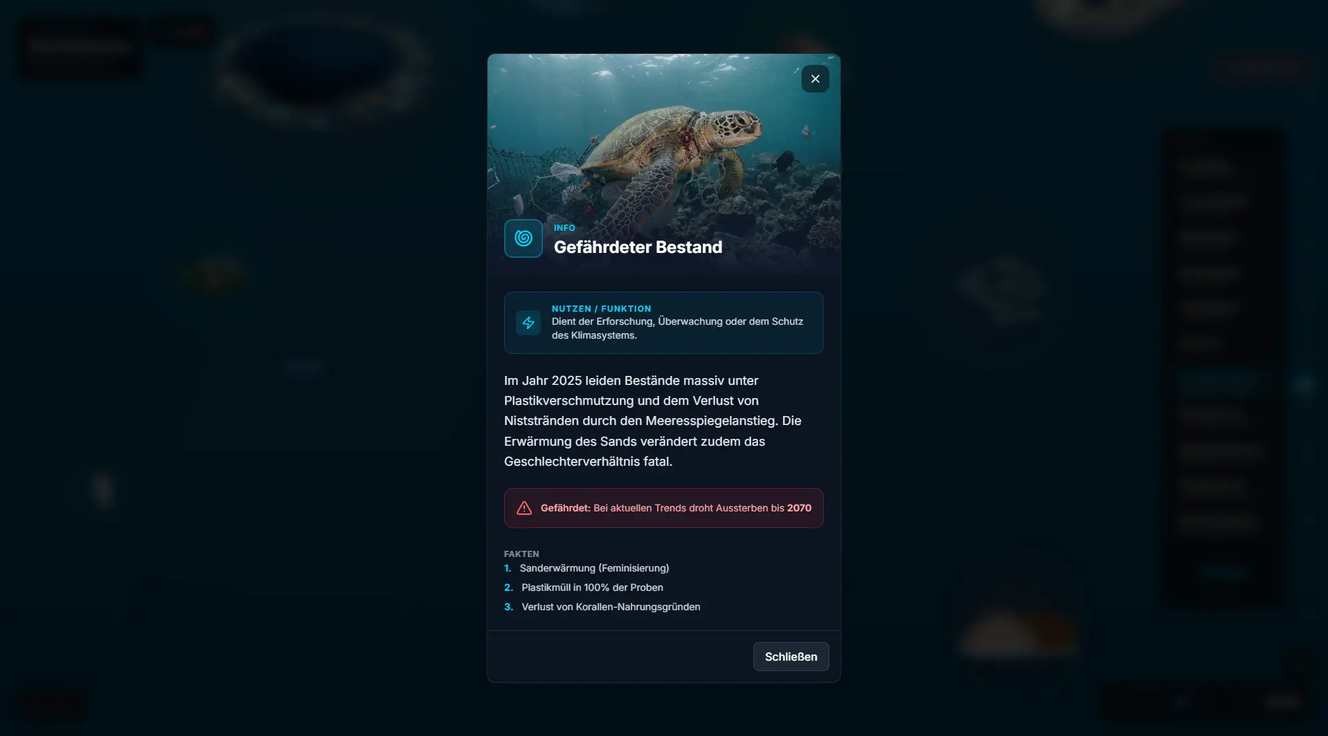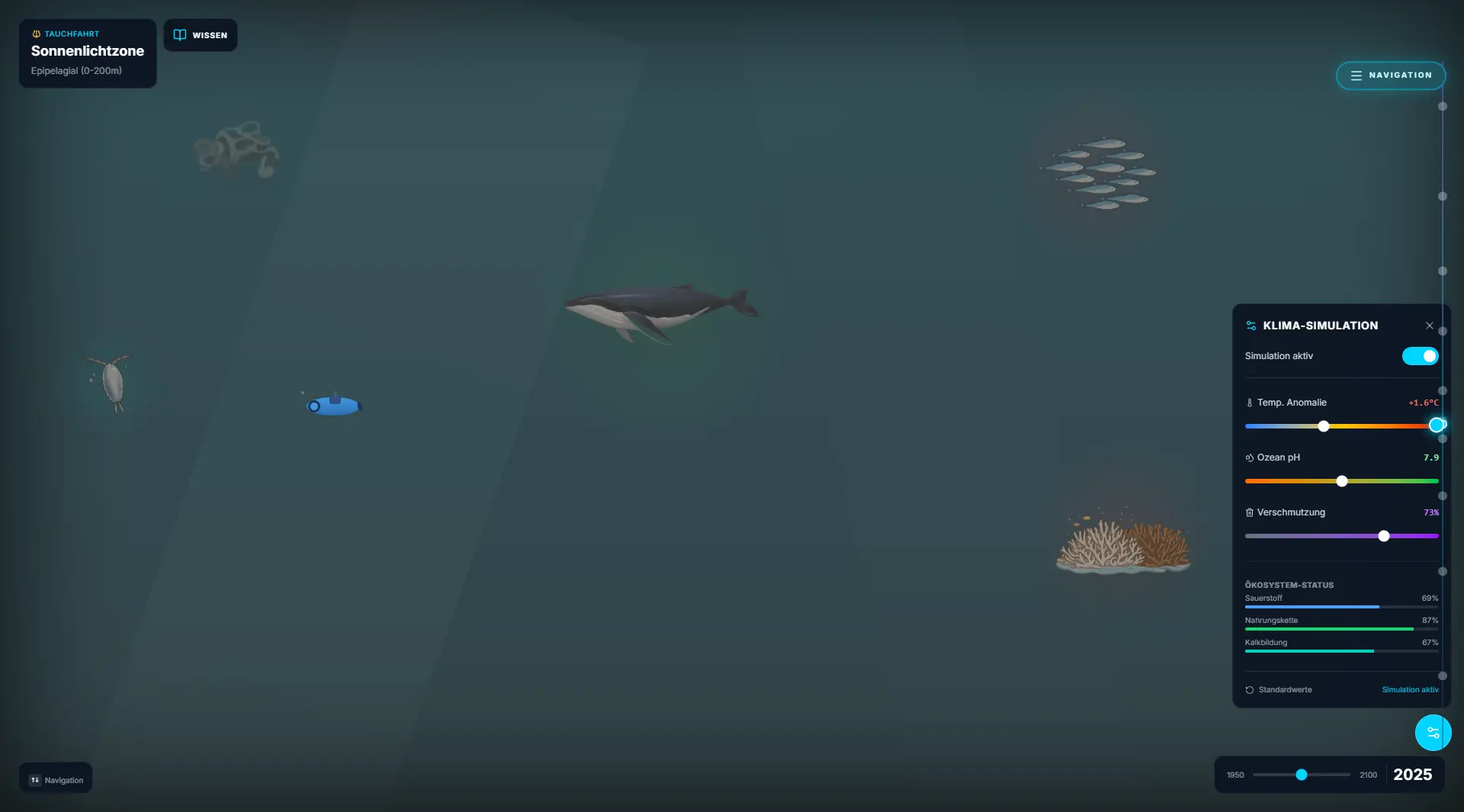 Die integrierte Klima-Simulation zeigt anschaulich, wie sich Temperaturanstieg, Ozeanversauerung und Verschmutzung auf verschiedene Ökosysteme und Technologien auswirken. Objekte verändern sich je nach eingestelltem Jahr und Klimaszenario: Korallenriffe bleichen, Wale verhungern, oder Technologien werden eingeführt.